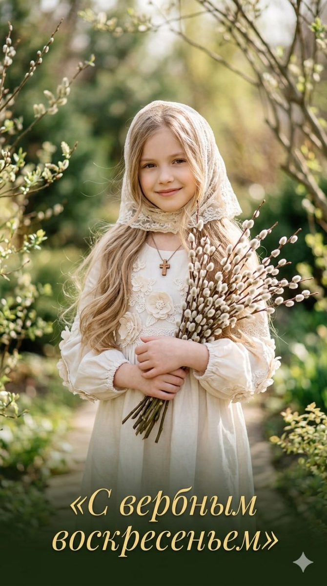 Уже завтра Вербное Воскресенье! сохранить черты лица с загруженного фото в точности. девочка с длинными волосами, слегка развевающимися по плечам, задумчиво держит букет пушистых веточек вербы. светлое платье с рукавами украшено воздушными тканевыми цветами, на голове — полупрозрачный платок. поза — полупрофиль, взгляд направлен в камеру, нежная улыбка. в руках — ветки вербы с мягкими белыми серёжками, на фоне приглушённой зелени и размытых тонких веток деревьев. свет мягко падает сверху и чуть сбоку, подчёркивает текстуру ткани, шелковистость волос, создаёт плавные, едва заметные тени на лице и руках. атмосфера спокойствия и тёплого весеннего утра. высокая текстурная детализация, качество 8k, соотношение сторон 9:16. внизу надпись красивым золотым шрифтом: «С вербным воскресеньем». most-AI.com - 80+ популярных нейросетей в одном приложении без VPN. Лучшие цены! 75% кэшбэка на бонусный баланс по промокоду PROMPT1RU_75 Еще у нас есть группа VK и специальный раздел на сайте https://p