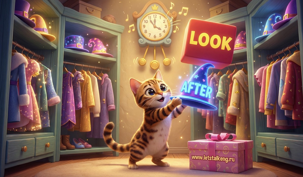 Сегодня наша любимая бенгальская кошка Фаня приглашает вас в свой словесный гардероб. Мы продолжаем покорять фразовые глаголы уровня B1 (сегодня у нас порция слов с 31 по 60 из списка Cambridge PET). В прошлый раз мы сравнивали их с кубиками Lego, а сегодня представим, что это модные костюмы, которые дают глаголам совершенно новые суперсилы. Готовы? Тогда открываем шкаф!