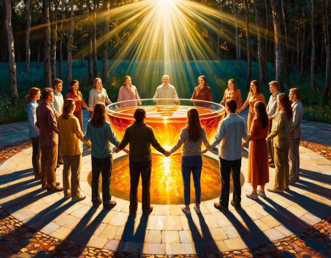 «Общий сосуд» — групповая практика, где люди делятся друг с другом добрым отношением, не тратя себя, а наоборот — наполняясь. Работает в любом круге: от трёх до пятидесяти человек. Суть проста: каждый кладёт в воображаемую чашу то тепло, которое может подарить другим, а потом забирает оттуда столько, сколько нужно ему самому. Только ведущий и участники. Никаких свечей, мандал, музыки — только тишина или спокойный голос. Лучше делать после дыхательной настройки, когда люди уже немного замедлились. Скажите примерно так: «Сейчас мы будем наполнять общий сосуд. Каждый мысленно положит туда что-то тёплое — пожелание, поддержку, добрый свет. Не из себя, а через себя. А потом каждый возьмёт оттуда ровно столько, сколько нужно. Сосуд не пустеет — чем больше в него кладут и из него берут, тем он полнее». Для двоих: встаньте или сядьте друг напротив друга. Представьте сосуд между вами. Каждый по очереди наполняет его мысленным пожеланием другому. Потом оба берут из сосуда. Работает удивительно —