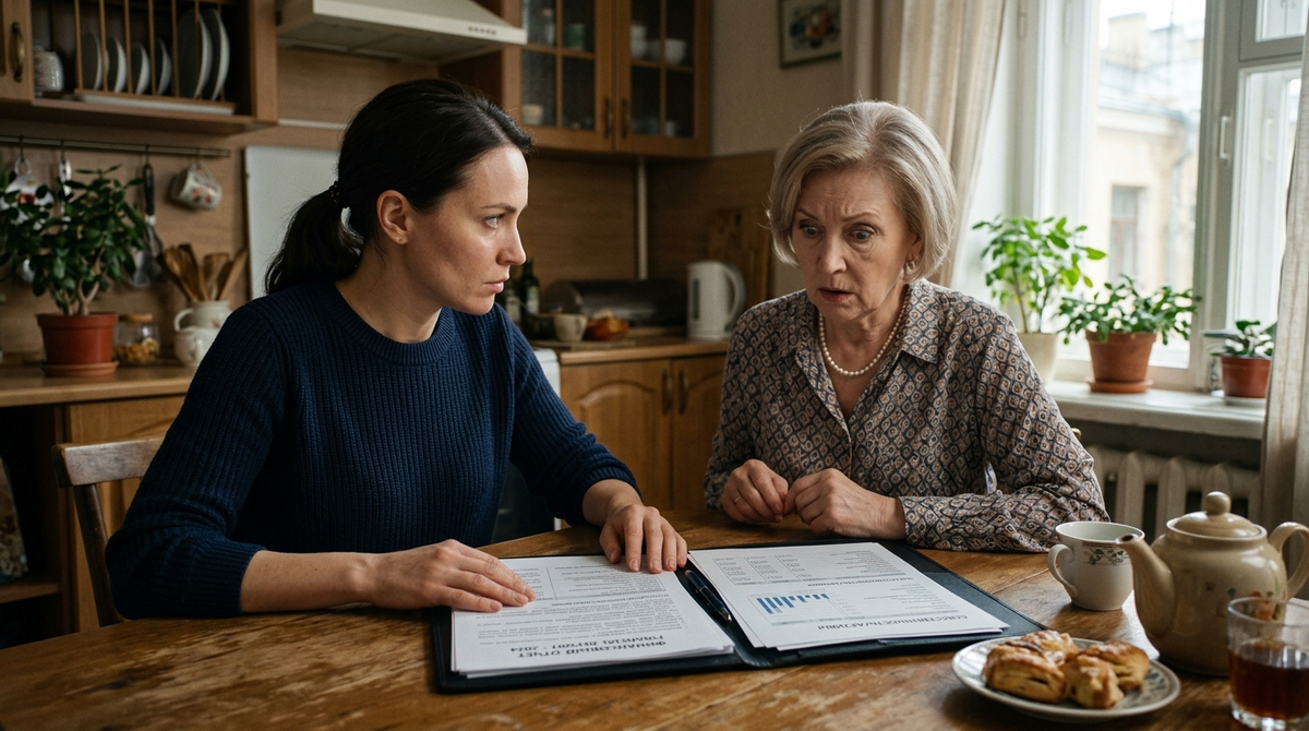 Свекровь посмотрела на папку и чуть сузила глаза, но за стол пошла. Сергей тоже поднялся — нехотя, как ученик, которого вызывают к доске.