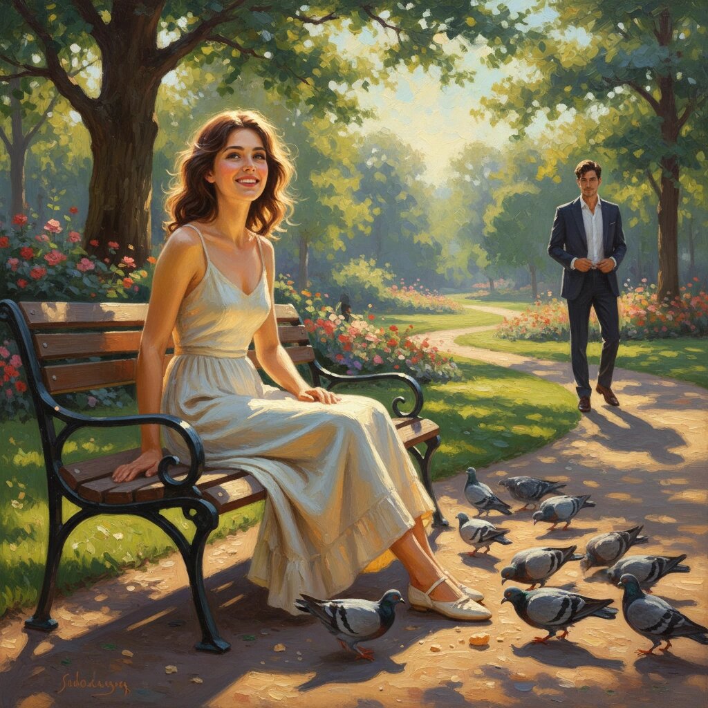 Сидя на лавочке, Кэти наблюдала за голубями, бродящими вокруг в поисках хлеба или семян. Ни того, ни другого у девушки не оказалось, поэтому она просто улыбалась, глядя на птиц.