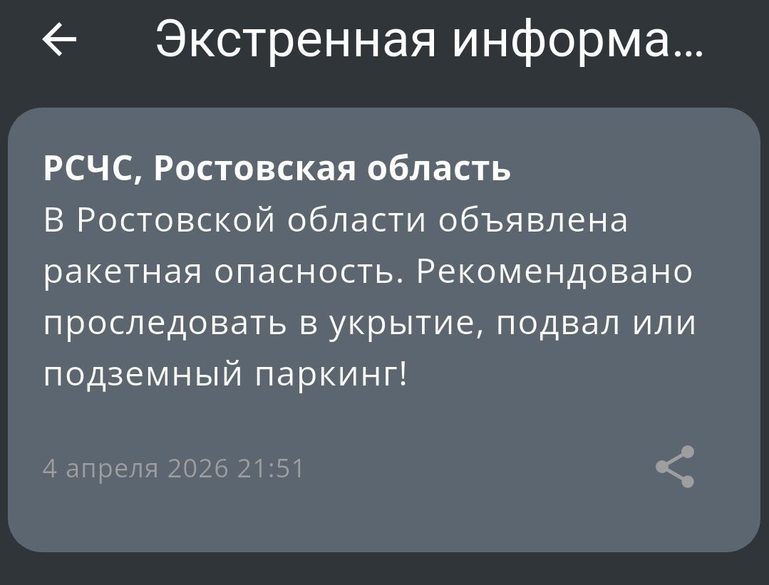 ❗Объявлена ракетная опасность в Ростовской области