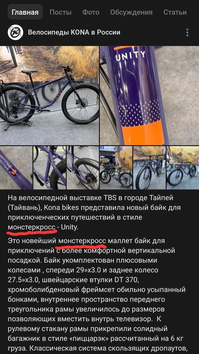 Как же калит с того факта, что в русскоязычном интернете «монстркроссом» обзывают разного рода mtb на плюсовой резине. Вот ответьте мне, чем люди руководствуются, когда пишут под абсолютно разными велосипедами это, уже без преувеличения, слово-паразит? Можете считать это бахвальством, но я довольно много прошерстил западных сайтов в поисках пруфов того, что же такое этот пресловутый «монстркросс». И единственное внятное определение дал Джо Мейзер – один из создателей Salsa Fargo. Давая интервью одному из западных изданий он рассказал предысторию создания Fargo, где акцентировал внимание на велосипедах того времени и там, о шок, были монстркроссы. Джо и другие участники Tour Divide монстркроссом называли велосипеды для велоскросса (то есть цк), в которые влезали покрышки 45 мм и шире. Примеры Джо тоже привел: Surly Cross Check и Salsa Las Cruces. Так что Kona Unity никакой не монстркросс, а очередной rigid-mtb с необычной геометрией переднего треугольника – не более.