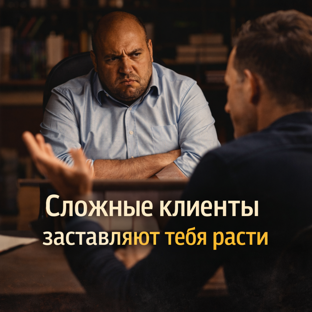Есть клиенты, после которых хочется петь. А есть те, после кого хочется выть или молча смотреть в стену и вспоминать, зачем ты вообще в эту профессию пошел. И вот парадокс: именно вторая категория часто делает тебя сильнее. Потому что приятный клиент подтверждает твою компетентность. А сложный проверяет твою профессиональную сборку. Каковы они, сложные клиенты? Это не обязательно хамы. Часто это люди с большим влиянием, с тяжелым стилем контакта, с высокой тревогой, с привычкой доминировать, с сильной подозрительностью, с эмоциональной нестабильностью или просто с таким уровнем сложности, где твои обычные приемы перестают работать. Особенно это видно в работе с собственниками и людьми из окружения рядом первого лица. Потому что у них запрос почти никогда не равен реальной задаче. Человек может говорить: мне нужны новые навыки презентации, мне нужно усилить влияние, мне надо прокачать команду…. А на самом деле внутри может быть страх потерять значимость, желание вытеснить конкурентов, х