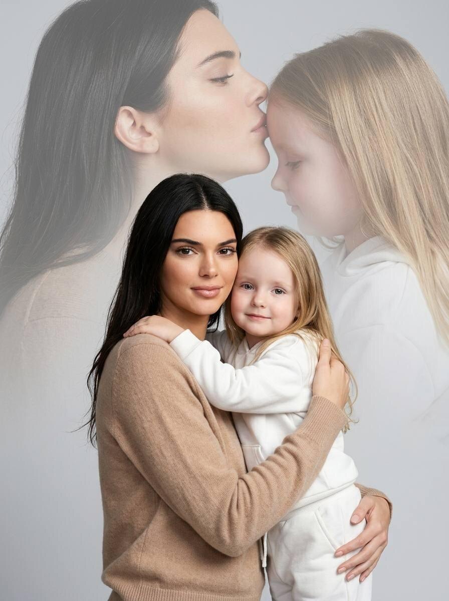 Сгенерировать фото⚡️ Промты для нейросети🖼 СТРОГО сохранить внешность людей с загруженных фото 1:1 — лицо, черты, пропорции, текстуру кожи и возраст без изменений, без ретуши. Фото — единственный эталон внешности. Формат 3:4. Ультрареалистичный студийный портрет матери и ребёнка с двойной экспозицией. Передний план полностью непрозрачный: мать и ребёнок по пояс стоят в обнимку, ребёнок обнимает маму за плечи, спокойные нежные взгляды в камеру, мягкие улыбки. Одежда: мама — мягкий трикотажный свитер тёплого бежевого оттенка с длинными рукавами, ребёнок — белый спортивный костюм. Задний план: крупный полупрозрачный профиль матери, прижимающейся губами ко лбу ребёнка, расположен выше переднего плана, непрозрачность около 40%, мягкое размытие, силуэты хорошо читаются. Фон мягкий студийный градиент светло-серого оттенка. Свет очень мягкий рассеянный слева-спереди, слабый заполняющий справа. Камера 85mm, f/2.8, ISO100, высокая детализация, без HDR и AI-look.