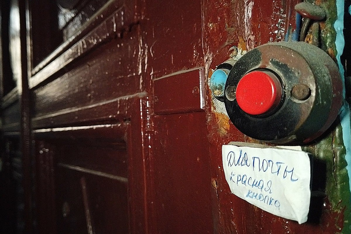 Кнопки дверных звонков на двери коммунальной квартиры, одна из которых выделена для визита почтальона.