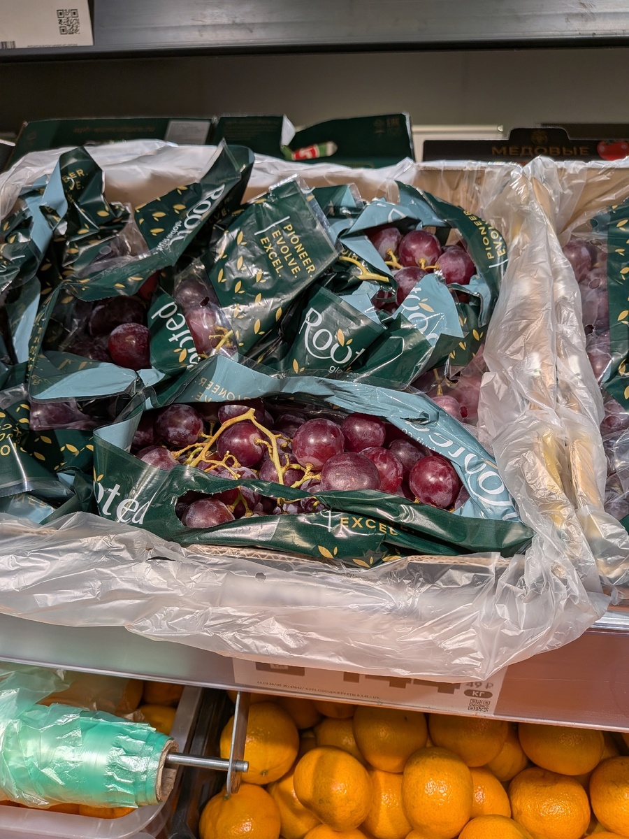 Зачастила, однако же, "Пятерочка" с новинками, но нам, покупателям, это только в плюс! Все еще не могу прямо-таки проникнуться этим магазином, все равно покупаю здесь меньшую часть продуктов, хотя то и дело заглядываю чуть ли не каждый день. Кстати, авось кому пригодится, уже около кассы нашла холодильник с мороженым, где были небольшие моти (одни с бананом, другие с шоколадом), так в них на 1 десерт всего 50 ккал выходит, хотя состав лучше не читать. Но речь сегодня не об этом, я решила поделиться найденными вновь новинками, поскольку магазин все же продолжает работать над ассортиментом и пополнять его. Заметила еще такую особенность, что у нас три "Пятерочки" в шаговой доступности, но все они между собой отличаются скидками, я предварительно по каталогу смотрю где ниже стоимость и иду туда, почему так - не понимаю. Но вернемся к найденным 03.04 новинкам: Начинается сезон вкусных фруктов, так что в магазинах можно уже найти коробки с тем, чего не было. Виноград не видела давненько, а