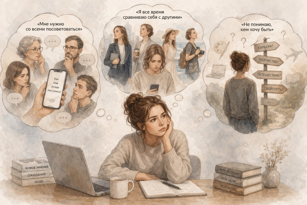 Чаще всего ощущение «я живу не свою жизнь» вырастает не из одного неправильного выбора, а из долгой привычки не выбирать себя вообще. Если в детстве и юности рядом были взрослые, которые лучше знали, что вам подходит, постепенно формируется опасная внутренняя логика: «другие понимают меня лучше, чем я сам(а)». Сначала это выглядит как забота. Родители выбирают кружки, друзей, одежду, вуз, оценивают увлечения, комментируют вкус, подсказывают, как «правильно». Ребенок в такой системе не обязательно живет в открытом насилии. Часто это вполне благополучная семья, где просто слишком мало места для самостоятельности. Но психика считывает не намерения родителей, а повторяющийся опыт: Во взрослом возрасте это превращается в зависимость от внешней опоры. Человек не то чтобы совсем не умеет думать. Он умеет, но не доверяет собственному выбору. Поэтому перед каждым решением включается привычный поиск авторитета: мамы, мужа, подруги, начальника, психолога, «более уверенных людей». Особенно болезне