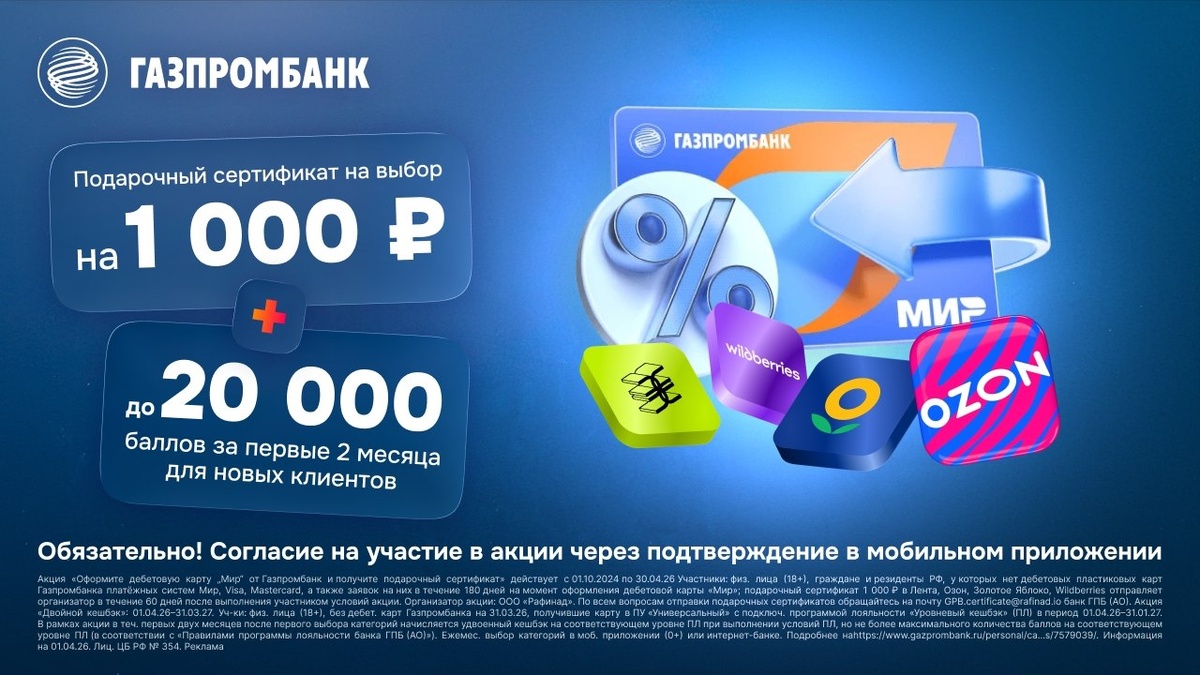 Сертификат номиналом 1 000 ₽ в подарок и кешбэк до 20 000 баллов