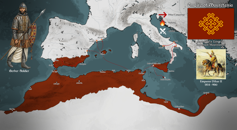 К началу X века, как показано на карте, Мавританская империя столкнулась с логистическими проблемами, неизбежными при управлении столь огромной территорией. Однако морское господство и единая монофизитская вера обеспечивали стабильность государства. На этом этапе истории Мавритания утвердилась как величайшее королевство западного мира, успешно бросив вызов как исламскому халифату, так и ослабевшим христианским империям Европы.