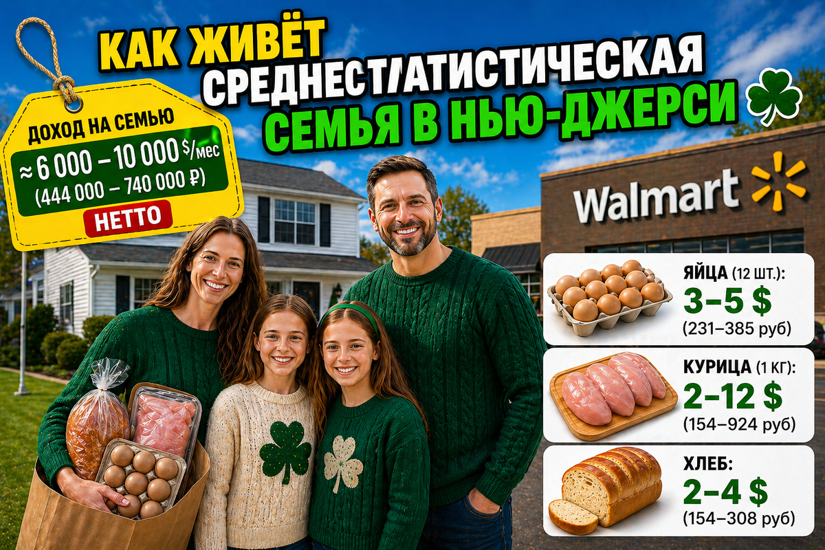 Средняя семья в Нью-Джерси живёт в доме около 180–200 м², с 3–4 спальнями, подвалом и гаражом. В доме обычно 2–3 телевизора, у каждого взрослого и подростка с 7–9 лет — смартфон уровня iPhone или Samsung, ноутбуки, бытовая техника (стиральная машина, сушилка, посудомоечная машина, микроволновка). Интернет — быстрый и стабильный.