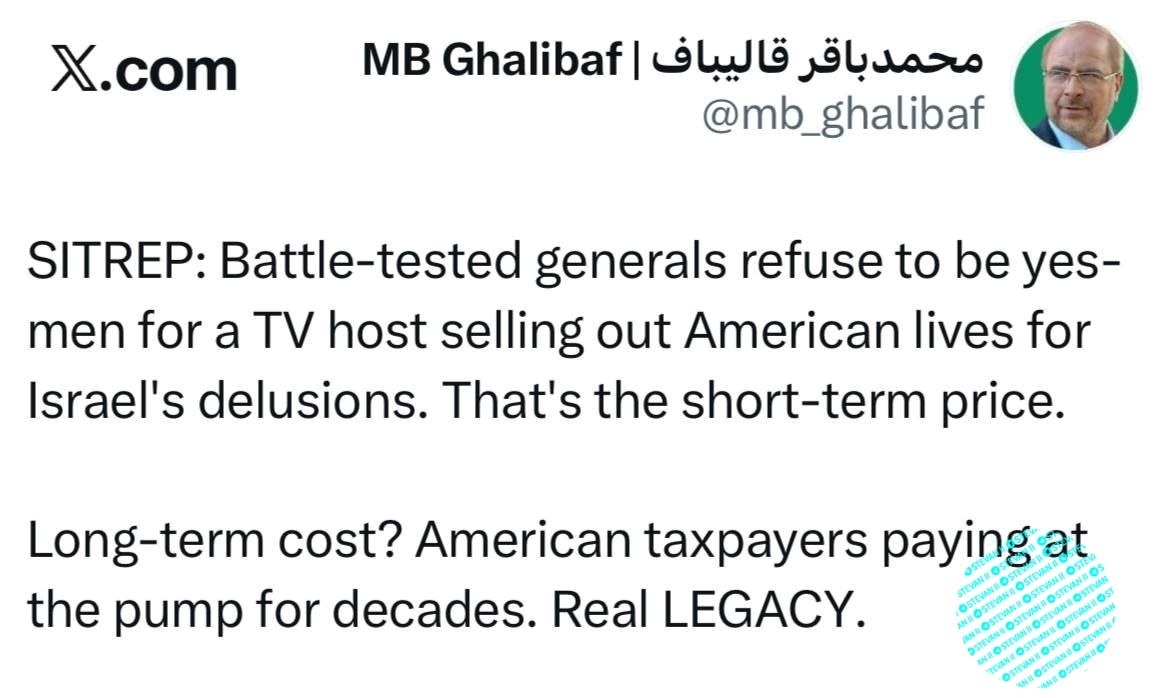 živote Amerikanaca radi iluzija Izraela Spiker parlamenta Irana: Izveštaj o situaciji: iskusni generali vojske SAD nisu spremni da budu poslušni izvršioci za televizijskog voditelja koji teži da žrtvuje živote Amerikanaca radi iluzija Izraela. To su kratkoročni troškovi. Dugoročni troškovi? Poreski obveznici SAD će plaćati na pumpama decenijama. Kakvo će nasleđe ostaviti iza sebe! ✅ Stevan II | Pojačajte nas