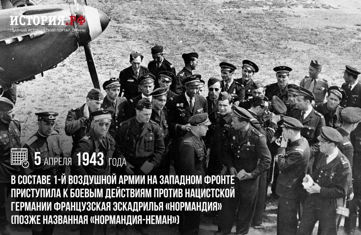Приступила к боевым действиям против нацистской Германии французская эскадрилья «Нормандия». В марте 1942 года Национальный комитет «Свободная Франция» обратился к Правительству СССР с предложением направить на советско-германский фронт группу своих летчиков и авиамехаников. 31 марта согласие на это было получено. 25 марта 1943 года эскадрилья «Нормандия» в составе 12 боевых самолетов убыла на фронт. Во время пребывания на советско-германском фронте эскадрилья «Нормандия», а впоследствии полк «Нормандия – Неман» прошли боевой путь от Курской дуги до Кенигсберга. Французские лётчики совершили более 5 тысяч боевых вылетов, провели 869 воздушных боёв, сбили 273 и повредили 50 фашистских самолётов #ПамятныеДатыВоеннойИсторииОтечества #ДеньВИстории #ГодЗащитникаОтечества #80ЛетВеликойПобеды Источник: https://vk.ru/wall-21621 Подпишитесь на наши группы ВКонтакте, в Одноклассниках, в Телеграм - читайте, смотрите и комментируйте информационные материалы, предлагайте свои! Источник: Откры