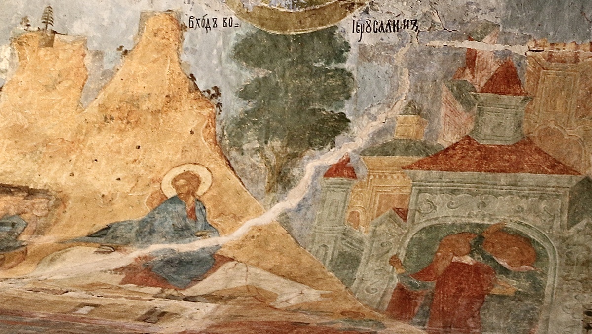 К сожалению, роспись сильно пострадала и утраченная часть очень велика, чтобы утверждать однозначно, что перед нами именно роспись на сюжет Входа в Иерусалим. Но если всмотреться и быть внимательным к деталям правильный ответ обязательно найдется.