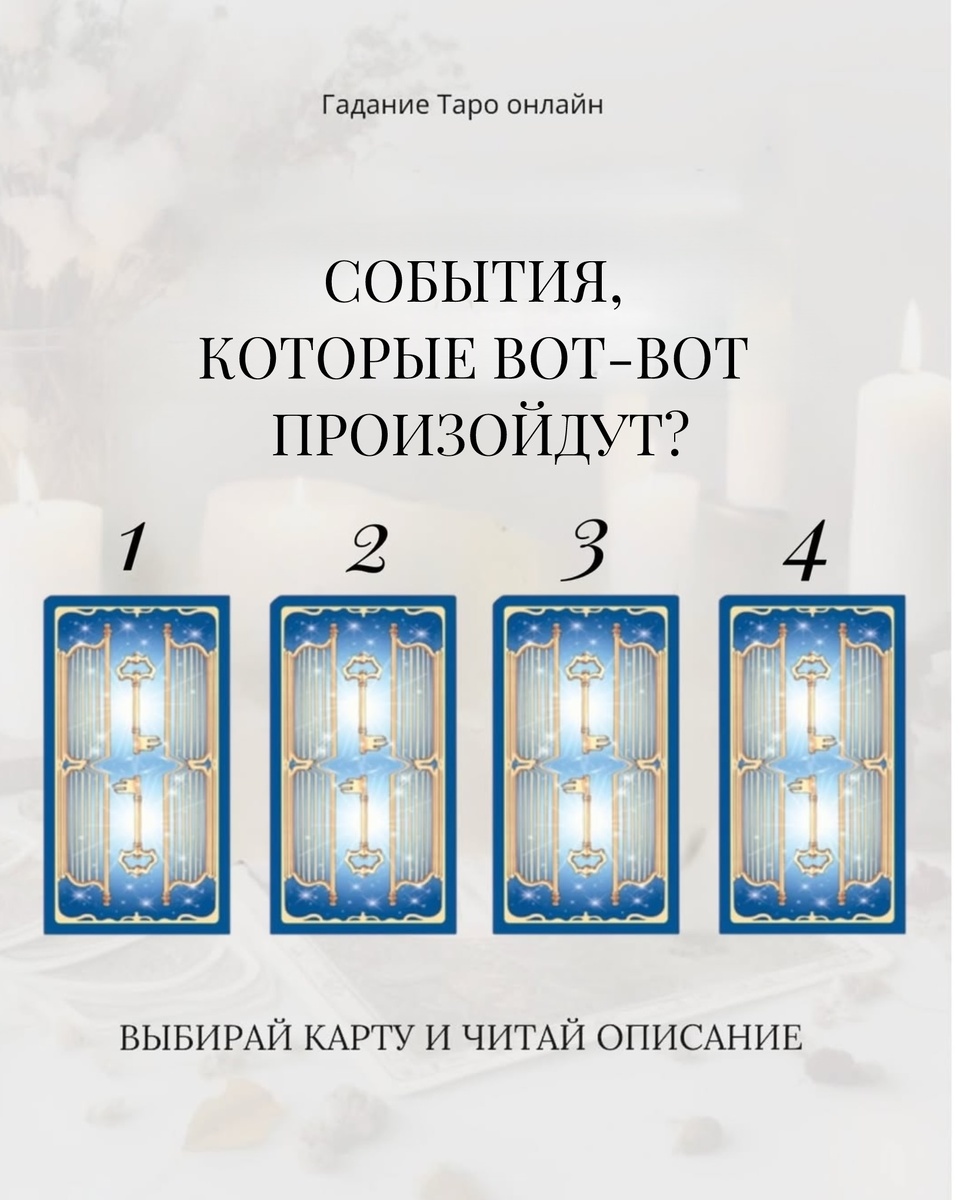 Иногда жизнь начинает ускоряться именно в тот момент, когда вы уже готовы к переменам. Это гадание покажет, какие события уже на подходе, какие энергии активируются вокруг вас и к чему стоит быть готовыми в ближайшее время. Постарайтесь читать не только умом, но и внутренним откликом — именно он подскажет, где ваше.