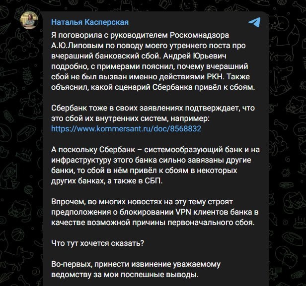 ❗️Наталья Касперская извинилась перед Роскомнадзором за то, что обвинила ведомство во вчерашнем сбое банковских систем