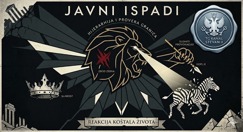 “ Nasuprot rasprostranjenom mišljenju, savet „ćuti – proći ćeš kao pametan“ ne funkcioniše. Tačnije, ne samo da ne funkcioniše, već u očima okoline jasno i beskompromisno označava slabost. Hajde da prvo razumemo prirodu ispada u javnom prostoru i usvojimo – to nikada nije šala ili slučajnost. Javni ispadi su stvar hijerarhije. Podizanje sopstvenog statusa putem snižavanja tvog. Zamislimo situaciju u savani: jedan lav prilazi i udara drugog šapom po njušci. Drugi, pokušavajući da ispadne pametan i ne nasedne na provokaciju, ne reaguje. Pogodi iz prve kako će čopor početi da klasifikuje obojicu lavova. Propušten udarac na koji nije odgovoreno iščitava se kao znak da je i drugima dozvoljeno isto. Niko neće ceniti oštroumnost i složenu strategiju ako nema odgovora u trenutku. I ne, to ne znači da treba nasedati na provokacije. To znači da treba naučiti odgovarati na njih tako da se provokatoru stegne tamo gde sunce ne sija čim mu padne na pamet da te provocira. Kako reagovati na provok