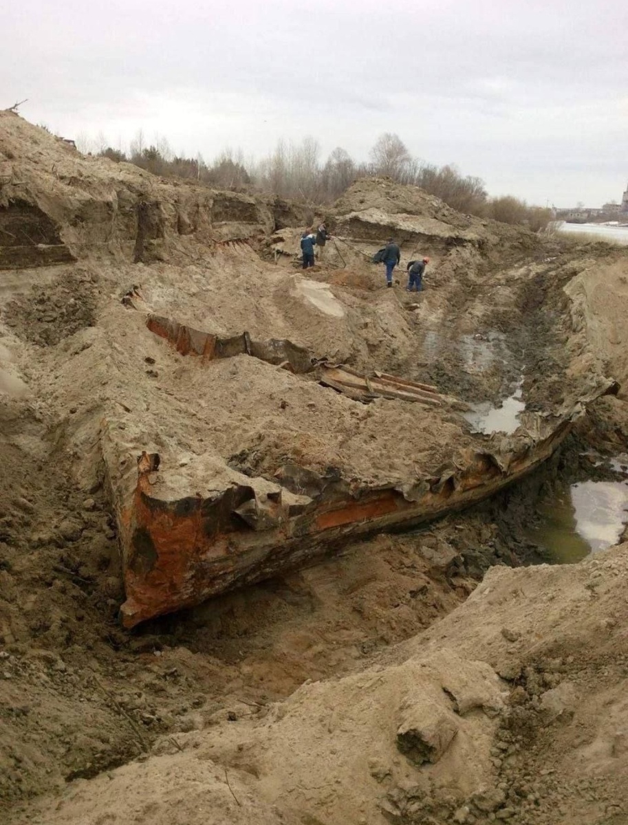 Из песчаного берега показалась носовая часть старого судна деревянного, но обитого железом. Казалось бы, отличный шанс для учёных изучить речное судоходство Сибири конца XIX века.