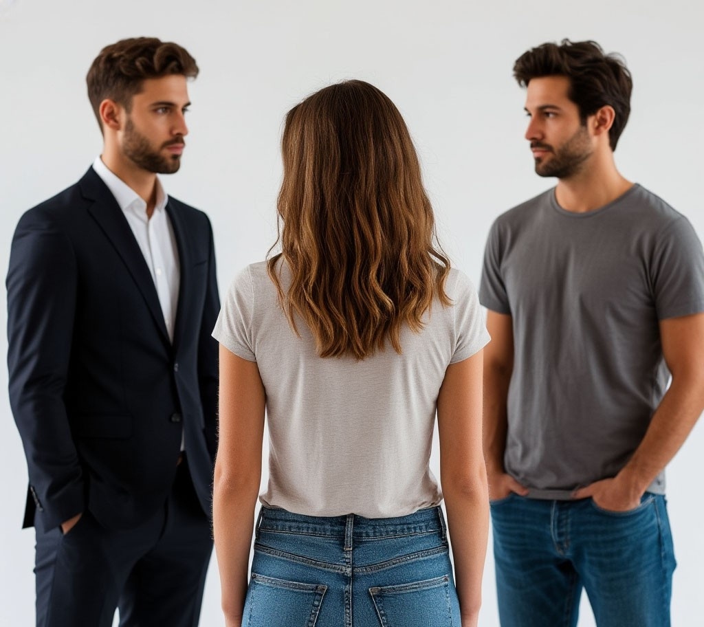 Надя сидела в комнате. Напротив неё на столе лежали два подарка. Слева — бархатная коробочка с бриллиантовыми серьгами, которые ей вчера вручил Саша. Справа — засушенная роза и билет на концерт её любимой группы, который Костя подложил ей под дверь вместе с запиской: "Этот дождь — всего лишь повод обнять тебя крепче".