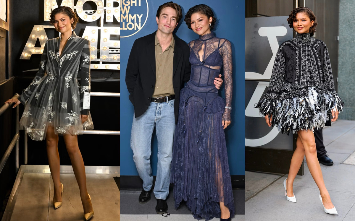 Ещё вчера пресс-тур фильма «Драма» напоминал почти свадебную хронику. Белые мини-платья, чистые линии, лёгкая романтика. И вдруг резкий поворот сюжета. В Нью-Йорке Зендея появляется сразу в трёх образах, которые словно показывают другую сторону истории. Более тёмную, более загадочную, почти театральную. Утро начинается с выхода на Good Morning America. Перед камерами актриса появляется в чёрно-белом ансамбле из коллекции Erdem осень 2026. Буклированный жакет и мини-платье с высоким воротом выглядят строго, почти академично. Но дизайнер добавляет деталь, которая разрушает всю правильность. Края украшены мягкой перьевой бахромой, словно ткань начинает растворяться в воздухе. В результате образ получается не просто элегантным, а немного драматичным. Точно настроение будущего фильма. Единственная светлая нота, классические белые лодочки Christian Louboutin. Через несколько часов актриса снова появляется в Erdem, но уже в другой версии этой истории. На этот раз основой становится чёрный жак