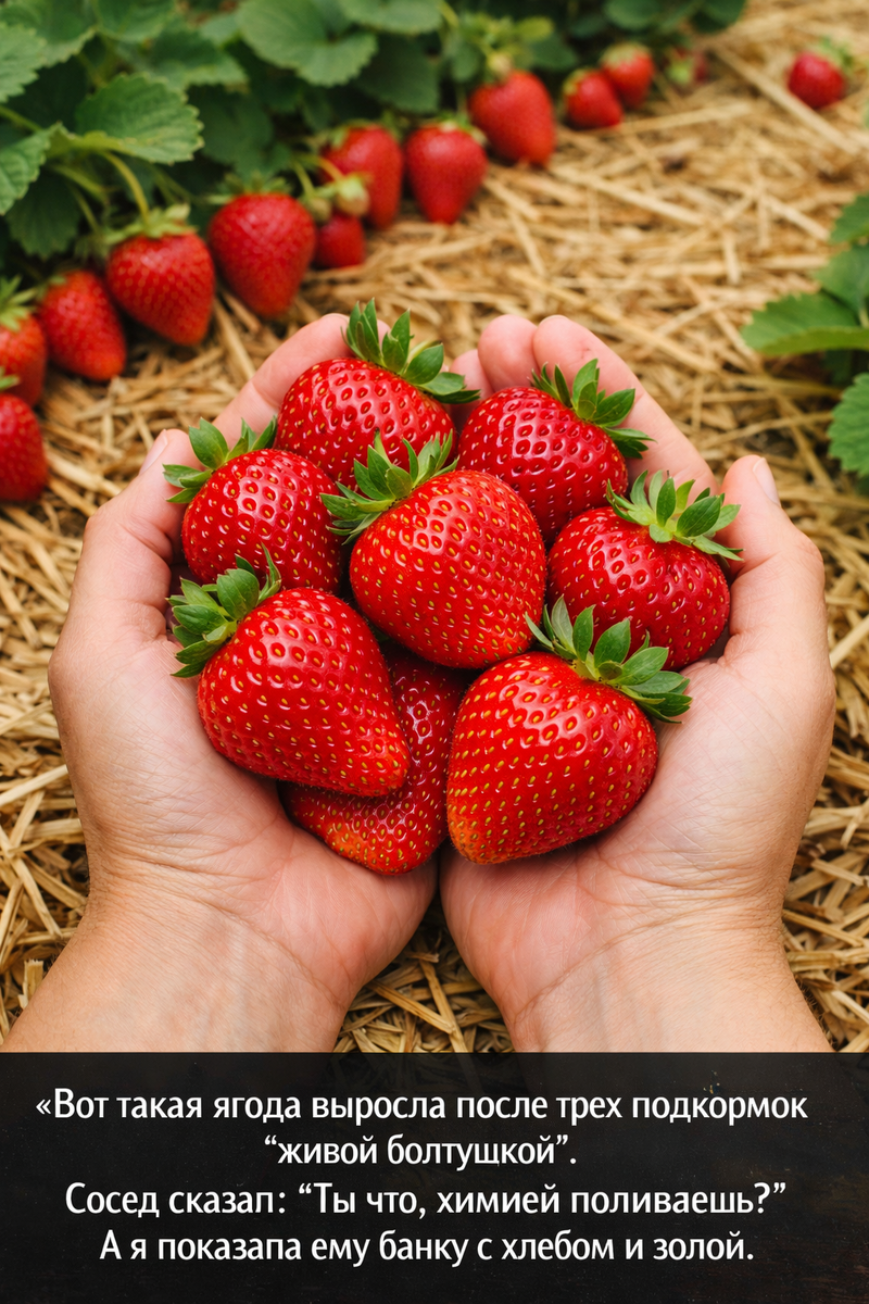 Вместе они дают синергию: дрожжи размножаются, выделяют тепло, зола поставляет калий, сахар кормит. Клубника получает идеальное питание в доступной форме.