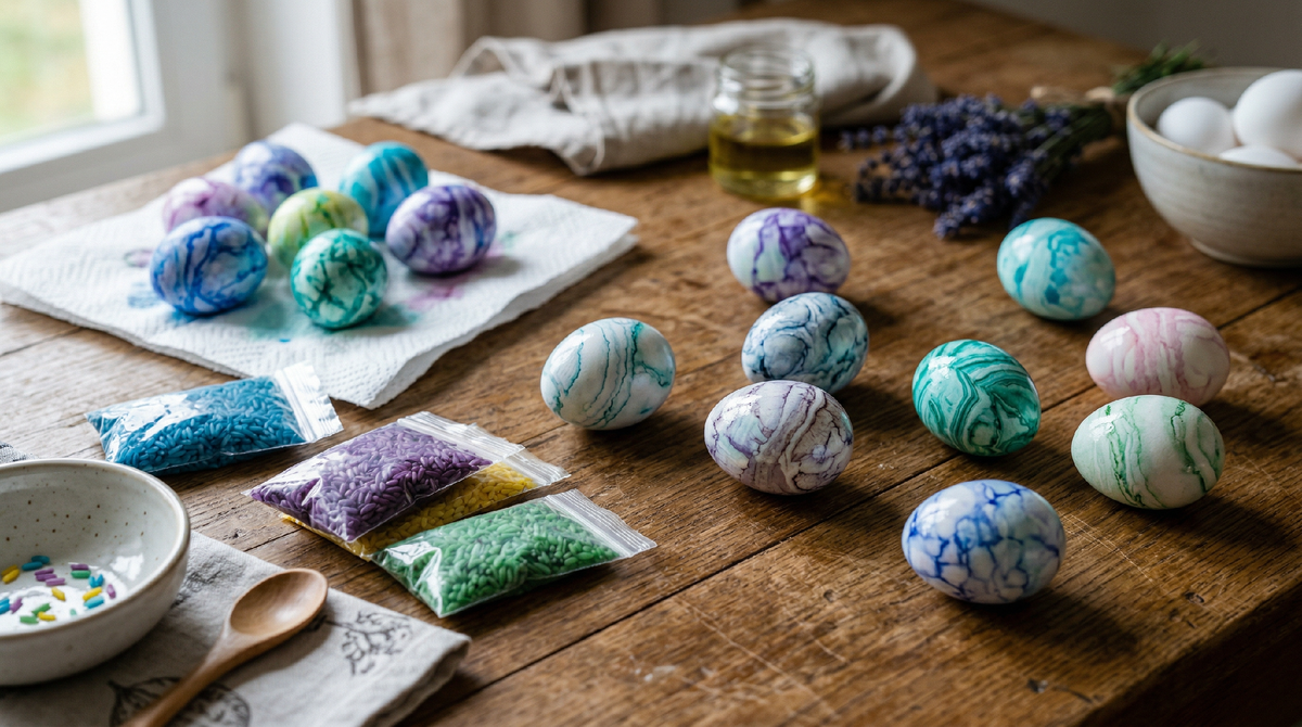 В-третьих, дети. Мои двое уже подросли и каждый год спрашивали: «Мам, а можно в этот раз сделать что-нибудь прикольное?» Прикольное — это синие, фиолетовые, бирюзовые яйца. С узорами. С эффектами. Чтобы было похоже на что-то космическое или каменное. Луковая шелуха такого дать не могла, как ни старайся.