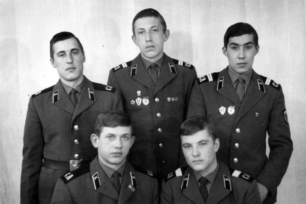 Групповой снимок рядовых и гвардии младших сержантов артиллерии в открытых парадно-выходных мундирах с нашивными погонами образца 1969 года