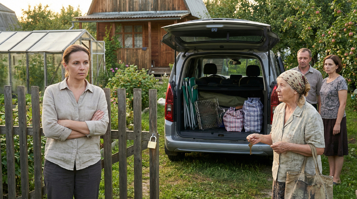 Марина подняла голову от стола и посмотрела в окно. У калитки стояла Валентина Павловна. На ней был светлый плащ, на локте висела большая сумка, а в руке поблёскивал старый латунный ключ. За её спиной у дороги остановился серый минивэн. Задняя дверь была уже открыта.