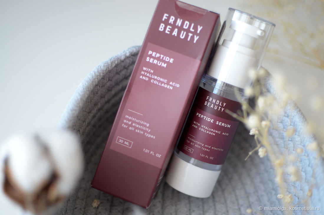 Много положительных отзывов собрала данная сыворотка в частности и бренд Frndly в целом. Наконец, и в мои руки попали два флакона: данный пептидный серум и увлажняющий крем для лица. Frndly Beauty — молодой бренд уходовой косметики, родом, кажется, из Санкт-Петербурга. Я отмечу современные формулы, качественная упаковка, достойные уходовые свойства. Сыворотка обещает работать в первую очередь за счёт комплекса пептидов. А это, надо иметь ввиду, не быстро и не скоро. Такие составы — работа в долгую, на перспективу. И надо сказать, я верю. Если сравнить сегодняшних женщин 40+ и наших мам/бабушек, то кажется косметика действительно работает. Что по пептидам? Palmitoyl Oligopeptide, Palmitoyl Tetrapeptide-7, Palmitoyl Tripeptide-5 — все Упаковке зачёт! Плотные пластик, отличная помпа-дозатор. Одного нажатия хватает на всё лицо. Я нажимаю два раза и наношу сыворотку на шею. Текстура — лёгкий гель, почти без запаха. Впитывается моментально. Увлажнение не пролонгированное, поэтому закрываем к