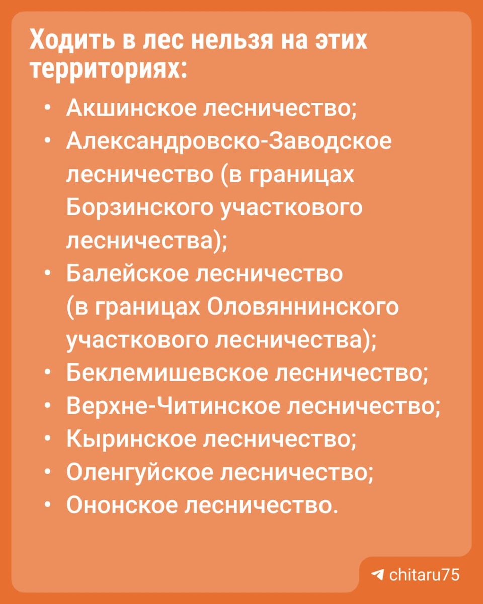 Запрет на посещение леса ввели в Забайкалье. Ограничения продлятся с 3 по 23 апреля. Соответствующее постановление правительства региона выложили на сайте опубликования правовых актов. Согласно документу, под запрет попали 8 лесничеств.⬆️ Также запрет действует и в Читинском лесничестве, кроме леса от Каштакского кольца по объездной трассе до перекрестка с Верхоленской, горнолыжного комплекса «Высокогорье» и «Сухотино», где находится табличка «Место отдыха». Органам власти в населенных пунктах и районах порекомендовали: ⏺рассказать населению о необходимостм соблюдать ограничения и передавать информацию о них в местные СМИ; ⏺запретить разводить костры, сжигать мусор и сухую траву, а также вести другие пожароопасные работы на участках рядом с лесами и населенными пунктами; ⏺организовать патрулирование опасных участков силами МЧС, полиции и инспекторов для быстрого реагирования на пожары и поиска нарушителей; ⏺расчистить участки от сухой травы, мусора и других горючих материалов,