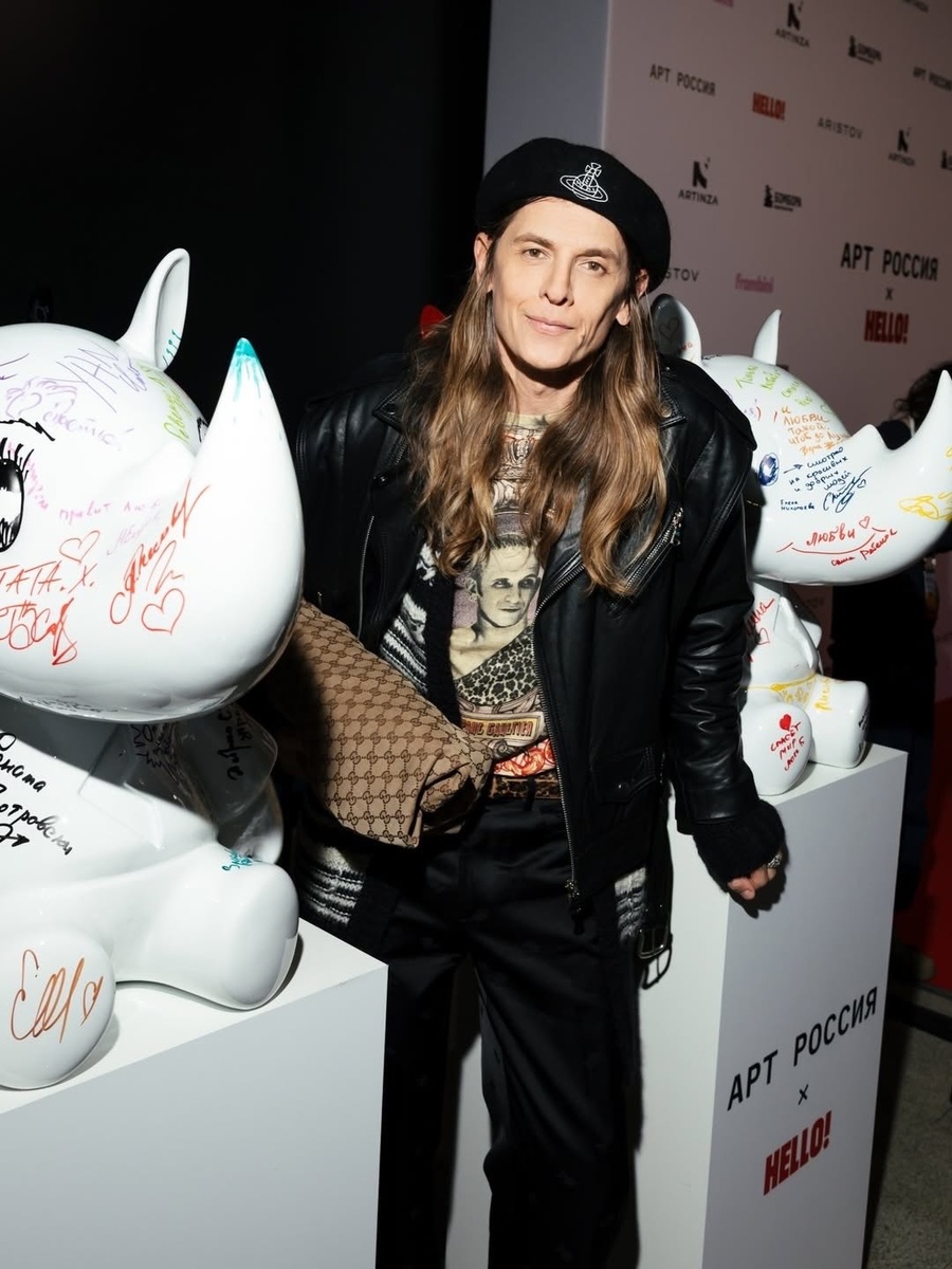 Влад пришёл ровно в своём жанре: кожанка, кепка, майка с принтом, брендовая сумка. Это стиль человека, который не пытается понравиться, а просто живёт в своём образе. И на арт-ярмарке он смотрится органично: будто вышел на минутку, но выглядит как герой стритстайла.