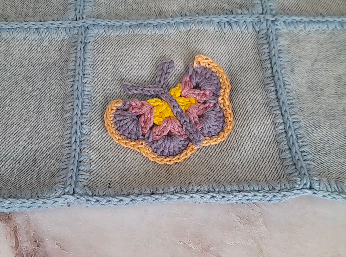 Я всех рада приветствовать на своем канале. Спасибо, что нашли время и заглянули. Вы на канале "Вяжу опять и снова. Вязаномания" Я продолжаю рассказывать о том, каикие аппликации я вяжу для своей джинсовой сумки-переделки. А сегодня разберем, как связать бабочку крючком. Каждый ряд бабочки вяжется с лицевой стороны по полукругу. Для вязания бабочки я выбрала четыре разных цвета: желтый, розовый, сиреневый и абрикосовый, туловище бабочки я вязала сиреневым цветом. Вы можете выбрать те цвета, которые вам больше нравятся. Для вас ниже размещаю подробное описания вязания ряд за рядом. Условные сокращенные обозначения: в.п.- воздушная петля сбн - столбик без накида ссн - столбик с накидом пстб - полустолбик cc - соединительный столбик 1 ряд. Первый ряд вяжется желтым цветом. В круг амигуруми связать 4 в.п. (считается как 1 ссн и 1 в.п.), 2 ссн, 1 в.п., 2 ссн, 1 в.п., 2 ссн, 1 в.п., 1 ссн. Петлю затянуть. Нить обрезать, закрепить, концы спрятать. 2 ряд. Вяжется нитью розового цвета. В арку