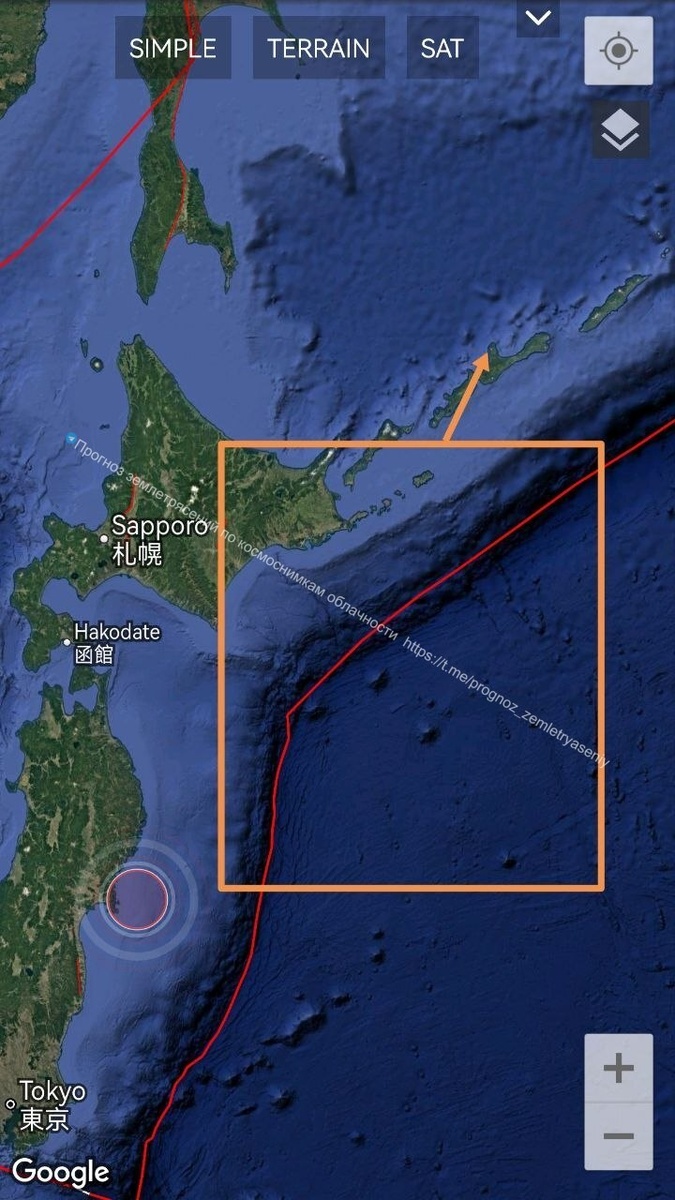 На уровне М6+ трассируется угол Тихоокеанской плиты между Хоккайдо и Южными Курилами.