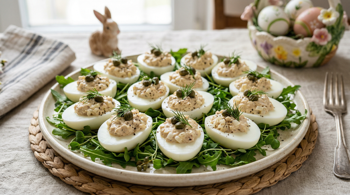Давайте начистоту: к пасхальному воскресенью большинство хозяек уже порядком измотаны. Генеральная уборка, покраска яиц, выпечка куличей, подготовка творожной пасхи — всё это отнимает массу сил. И когда доходит дело до закусок, хочется чего-то максимально быстрого, но при этом достойного праздничного стола. Фаршированные яйца с печенью трески и каперсами — ровно тот случай. На приготовление уходит от силы пятнадцать минут, причём большая часть этого времени — варка яиц, то есть процесс, не требующий вашего участия.