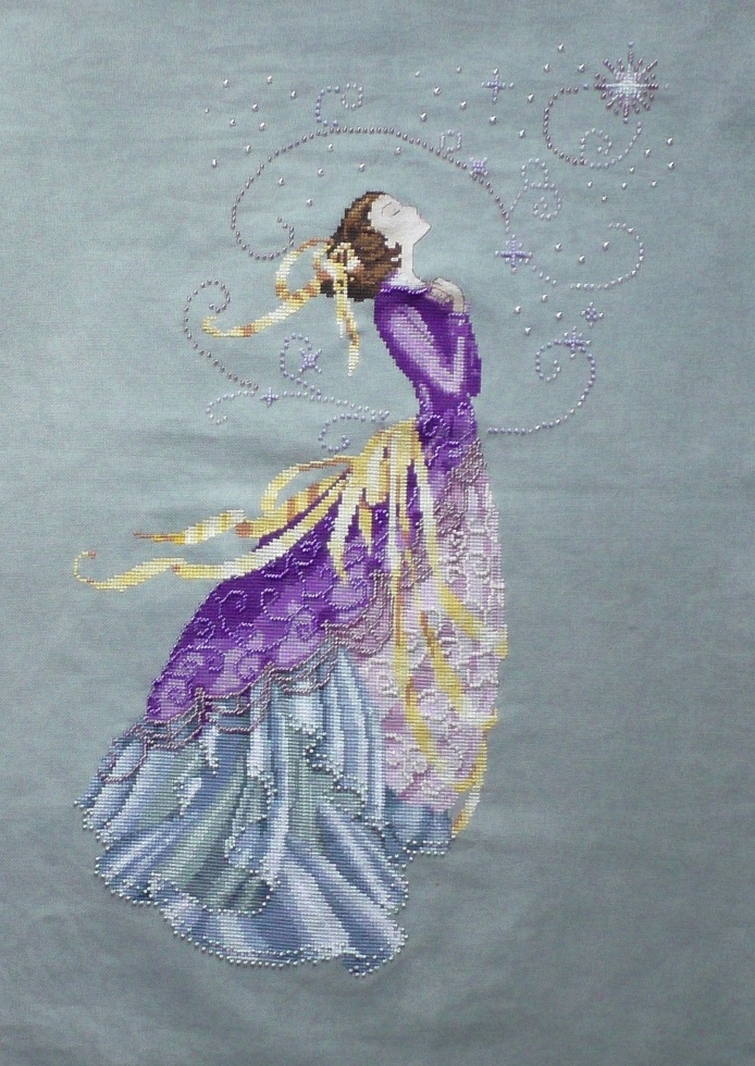 Думаю все любители Мирабилек узнали ее. Да, это Stargazer, или в вышивальном сообществе ее часто называют "Мечтательницей". Одна из самых первых разработок Норы Корбетт. Мой самый древний долгострой (теперь уже бывший) и практически полная конверсия. А так выглядит оригинал В видео про все свои вышивальные процессы на начало года рассказывала какие работы буду продолжать, какие "ушли в отпуск", над какими активно работаю, показала и эту вот в таком неприглядном виде Выключила камеру, и так мне ее жалко стало... и себя тоже)) Сама подбирала цвета ниток, выбирала бисер, да и работа была вышита почти на 50%. Взяла себя и иголку в руки и примерно за 10 дней с перерывами дошила. Основу красила сама, это Линда 27 к. От оригинального ключа остался только цвет нижней юбки, все остальное - моя конверсия. Случайно где-то увидела растяжку фиолетовых цветов и поняла, что таким должно быть платье у моей красавишны. Поскольку цвет ленты в ключе не подходил, то и ленту я сделала золотой. Сочетание