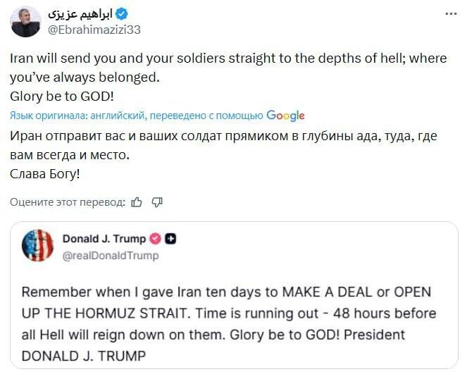 ». Али Абдоллахи заявил, что им там «самое место». Ранее Трамп пообещал «настоящий ад» для Тегерана, если в течение 48 часов не будет открыт Ормузский пролив. Подпишись на БородинLIVE Новости