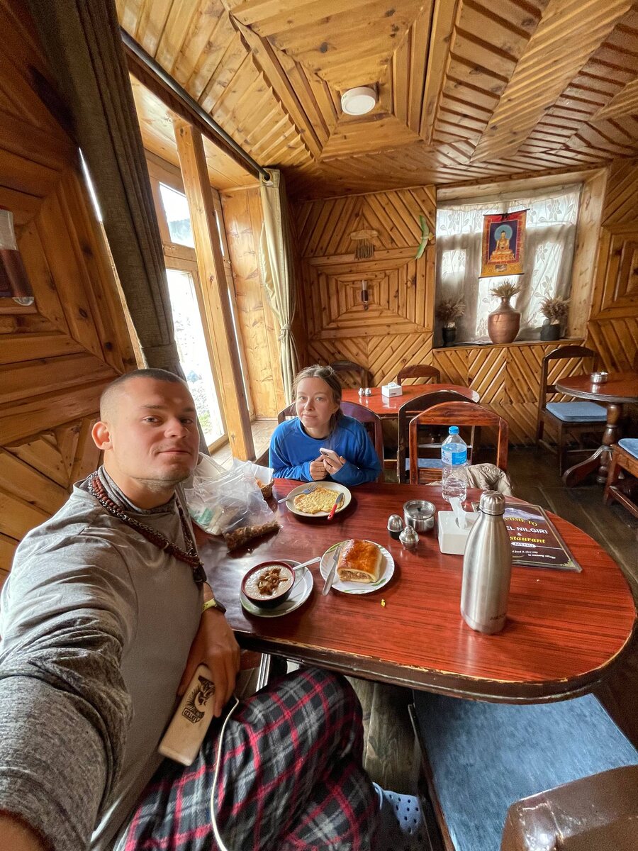 ️⃣ 🏔️ Кольцо Аннапурны День отдыха в Мананг 📈 ~3540 м 😤 Этот день был заслуженным отдыхом. После вчерашнего выживания просто дали себе выспаться - без будильников, без планов. В итоге окончательно проснулись только к 11. Честно - за один день полностью восстановиться практически невозможно, но стало заметно легче. 🥣 Позавтракали в лодже - уже стандарт: овсянка + своя смесь орехов, сухофруктов и булочка с яблоком местного производства, именно в Мананге распространена выпечка. А дальше - просто пошли гулять по деревне. Сам по себе Мананг - это не просто деревня в классическом понимании, а такой перевалочный пункт для трекеров. Люди приходят, остаются на акклиматизацию, отдыхают и идут дальше. Здесь реально появляется ощущение цивилизации: магазины, кафе, даже банкомат (который спас нас и пару русских ребят, которым мы помогли снять деньги 😬) 🛒 Прошлись по магазинам - есть вообще всё: от еды до газа, снаряги и даже кислородных баллонов. Но по факту - в основном обычный ту