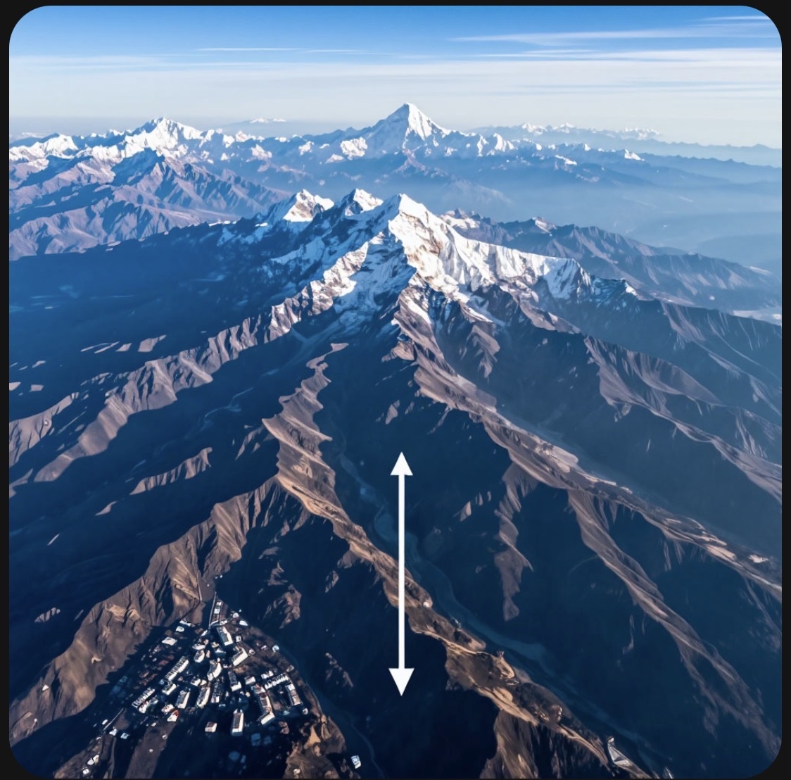 На снимке — вид на Эверест (высочайшую точку планеты — 8848 м!) из города Катманду. Расстояние между точками — целых 160 км! Стрелочкой чётко указан сам Эверест. 🗻➡️