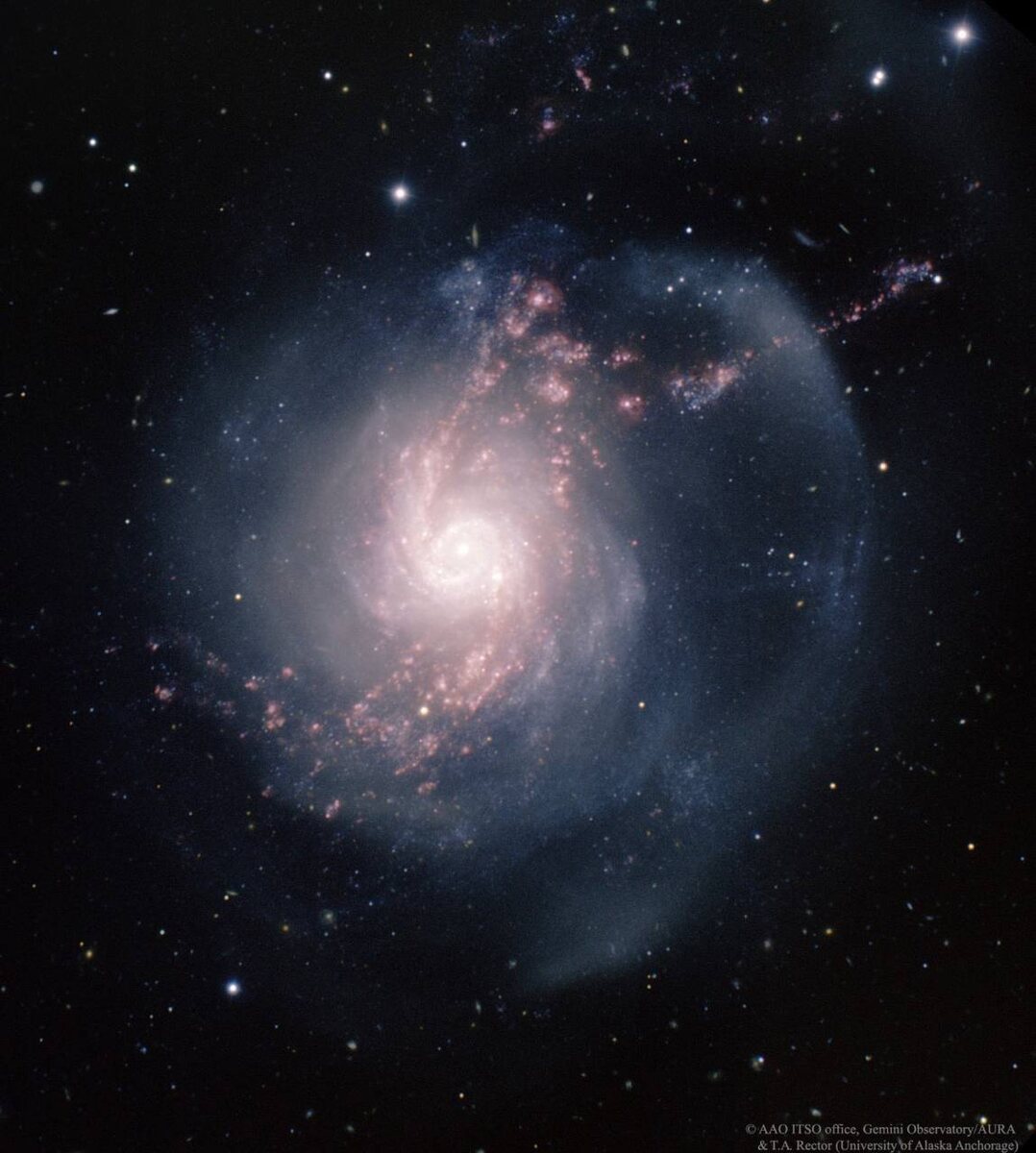 Дата: 2026-04-05 Авторы данных и изображения: AAO ITSO Office, Gemini Obs./AURA & T. A. Rector (U. Alaska Anchorage) Вечеринка в спиральной галактике NGC 3310 всё ещё в самом разгаре. Около 100 миллионов лет назад эта большая спиральная галактика, вероятно, столкнулась с меньшей по размеру соседкой. В результате она вспыхнула колоссальной вспышкой звездообразования. Как это произошло? Во время столкновения меняющаяся гравитация создала волны плотности, которые сжали существующие облака газа и запустили процесс рождения новых звёзд. Что показывает снимок с телескопа Gemini North? Это детальное изображение раскрашено так, чтобы подчеркнуть детали: · Розовым выделен газ (эмиссионные туманности) · Белым и голубым - звёзды (голубые - молодые и горячие) Некоторые звёздные скопления в этой галактике очень молоды, что указывает: галактики со вспышкой звездообразования могут оставаться в этом активном режиме довольно долго. Масштаб и расположение: · Диаметр NGC 3310: около 50 000 светов