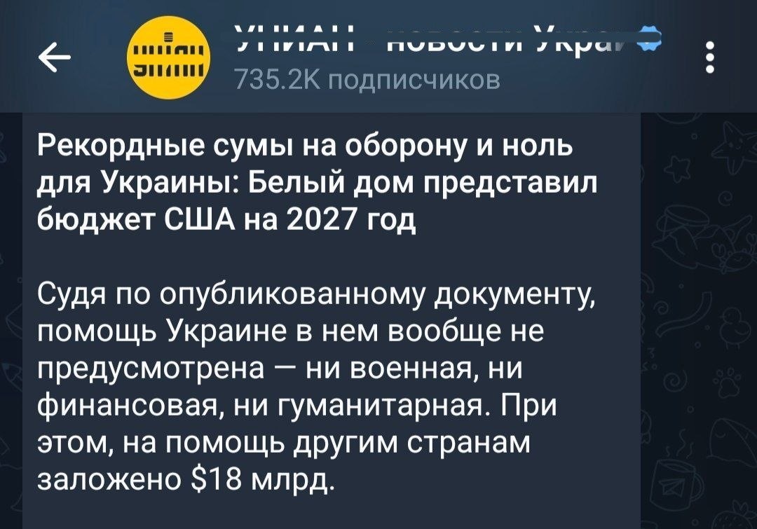 Администрация Трампа в расходы на оборону на 2027 год заложила $1,5 трлн. Из них Украине планируют выделить... Ноль, ничто... ни на военные расходы, ни на "гуманитарные", ни на "карманные". ❗️В очередной раз США бросили своих "шестерок", чью роль сейчас исполняет Украина! Поездки карлика-попрошайки не помогли. 🌐 ТГ | 🇷🇺 MAX