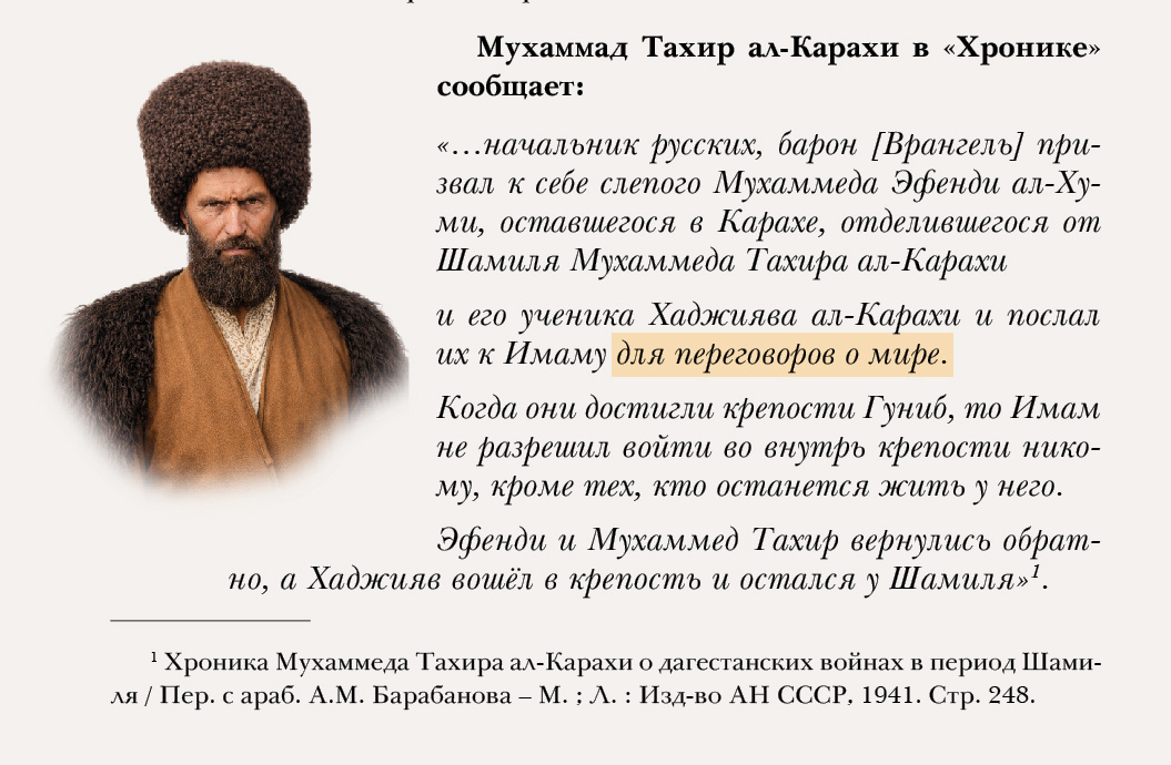 …По распоряжению Барятинского через парламентёров Мухаммеда Эфенди ал-Хуми и Мухаммеда Тахира ал-Карахи Имаму Шамилю предлагается обсудить окончание войны и заключение мира. Затем к переговорам подключается полковник Али-хан Аварский.
