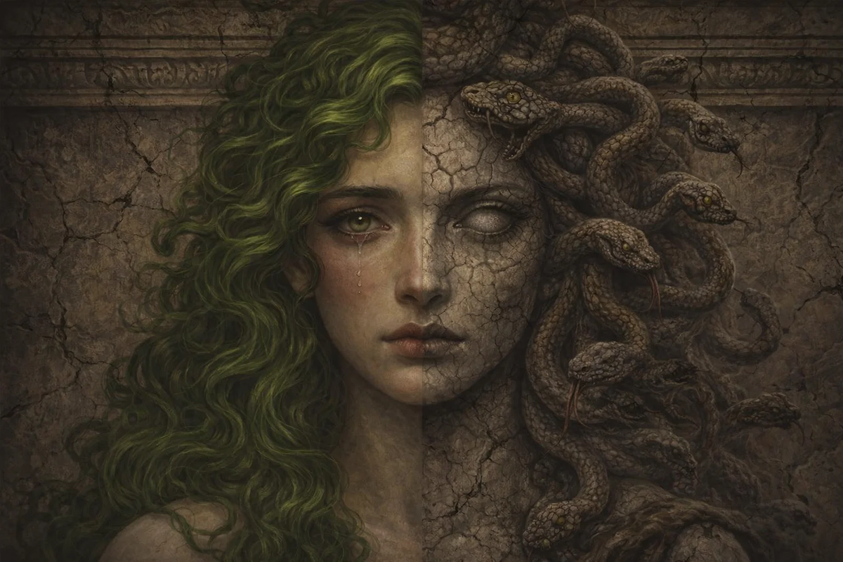 Прекрасная жрица с каре-зелёными волосами, чья красота сводила с ума смертных, стала самым страшным монстром греческих мифов. Её взгляд обращал в камень, а вместо волос шипели змеи. Но что, если Медуза никогда не была злодейкой? Что, если её история — это древнегреческий скандал о насилии, предательстве и жестоком наказании жертвы? В самых древних версиях мифа Медуза не была чудовищем с рождения. Она была морской нимфой или даже смертной жрицей Афины, славившейся неземной красотой. Особенно восхищали всех её волосы — роскошные, будто из шёлка. Она служила в храме богини мудрости, дав обет безбрачия и целомудрия. Её жизнь была посвящена служению. Трагедия случилась, когда бог морей Посейдон заметил красавицу-жрицу. Охваченный страстью, он преследовал её и насильно овладел ею в самом священном месте — храме Афины. Вместо того чтобы покарать насильника Посейдона (своего дядю и могущественного бога), Афина обрушила всю свою ярость на жертву. Медузу обвинили в том, что она «осквернила» хр