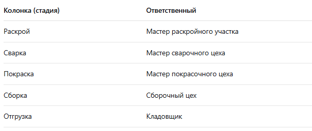- Действие: когда задача переходит на стадию «Раскрой» → автоматически создать задачу для мастера раскройного цеха (исполнитель — мастер цеха, срок — 4 часа, описание — «Раскрой металла по заказу №…, размеры …»)