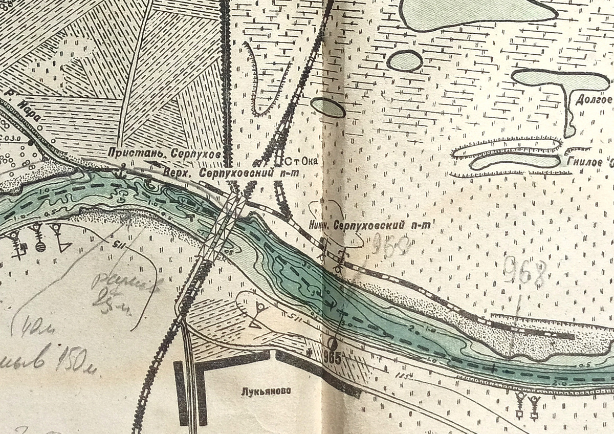 Небольшая станция Московско-Курской железной дороги Ока у Серпуховской пристани играла важную связующую роль между перевозками грузов по Оке и железной дороге. В наиболее полном виде подъездные пути представлены на речной лоции 1937 года: и карте РККА начала 1940-х годов: От главного пути Московско–Курской железной дороги отходил путь в сторону песчаного карьера, находившегося ниже по течению от пристани Серпухов. Карьер начал разрабатываться на этапе строительства Московско-Курской железной дороги — песок из него использовался для сооружения насыпи путей. От этого пути отходило ответвление в сторону пристани Серпухов, проходившее под железнодорожным мостом через Оку. ... Металлические фермы для моста изготавливались на заводе братьев Струве, что расположился на берегу Оки в старинной Коломне. Транспортировка ферм проходила четко и без задержек, вверх по течению все той же Оки. Единственное, что пришлось дороге вне плана, – дополнительно построить «станцию Ока-пристань», где выгружали