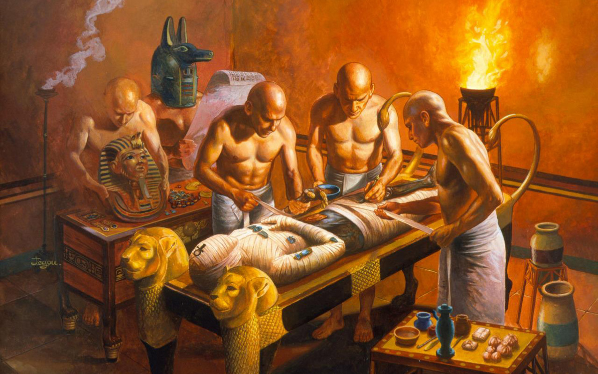 Египтяне верили, что смерть – необходимая ступень для путешествия в царство мёртвых (Западное царство). Чтобы попасть туда, нужно было соблюсти особый ритуал и сохранить тело в целостности. Сначала мёртвых хоронили в песке в узких могилах – так тело быстро засыхало и могло храниться очень долго. Позже египтяне разработали сложную технику мумификации: бальзамировщик извлекал внутренности с левой стороны и помещал их в канопы (специальные сосуды), затем тело высушивали с помощью соли и заполняли полость смолой и другими веществами для защиты от тления. Далее мумию оборачивали пеленами, между слоями помещали анкхи (египетские кресты) и изображения скарабеев, украшали драгоценными камнями, а в руку покойного клали благовония, посвящённые богу загробного царства Осирису. На церемонии похорон присутствовали родственники и друзья, для богатых вельмож приглашали плакальщиков и жрецов. В захоронение помещали личные вещи, еду, а иногда – умерщвлённых слуг, чтобы знатный покойный ни в чём не нуждался в загробном мире. После молитвы гроб опускали в саркофаг и запечатывали.