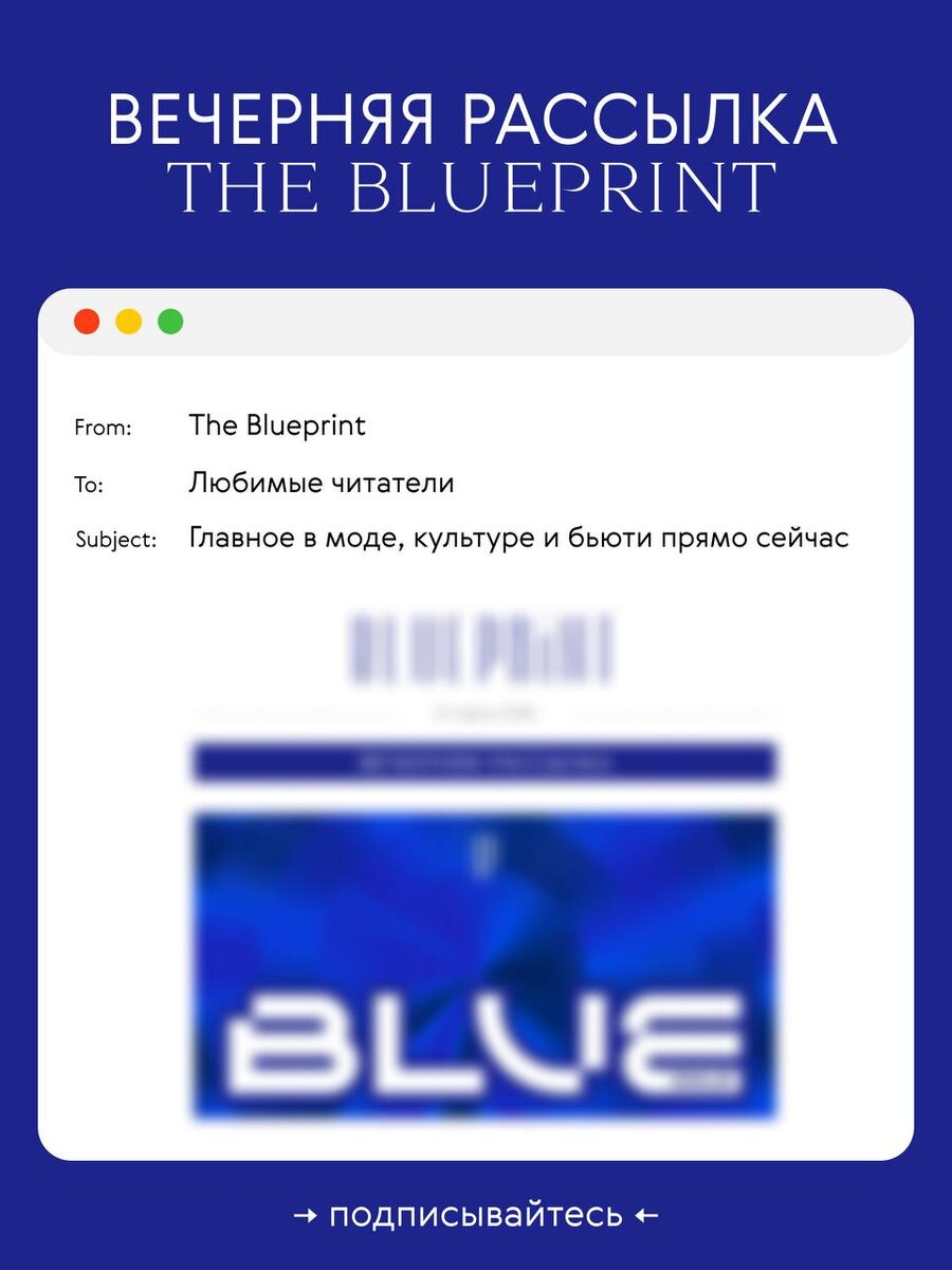 В ней мы ежедневно собираем самые интересные материалы и новости — чтобы вы оставались в курсе главных событий в моде, культуре и бьюти. Вам остается лишь подписаться на рассылку и убедиться, что письмо не улетело в спам. 🔹 The Blueprint