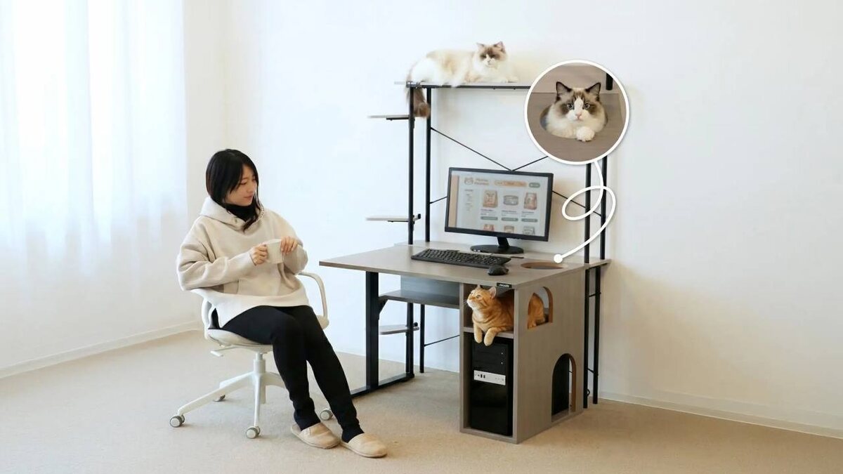 🎙 *️⃣Японский бренд разработал решение для любителей котов — рабочий стол со встроенными лежанками, тоннелями и когтеточками. Все необходимое, чтобы пушистый коллега был занят своим делом, пока вы зарабатываете на корм. Прототип отличный! Как думаете, оценит ли реальный пользователь в ходе тестирования? И кто же этот пользователь — человек или все-таки кот? 😁 ❤️ — за удобство котиков 🔥 — котики отдельно, работа отдельно ✈️ @Inex Service Design Live