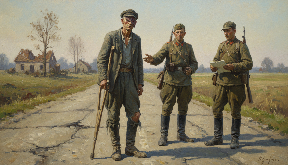 21 мая 1945 года двое бывших красноармейцев тормозят троих оборванцев на немецком шоссе. Один из задержанных опирается на костыль, второй глаз замотан грязной тряпкой. Жалкий вид. Никакой угрозы.