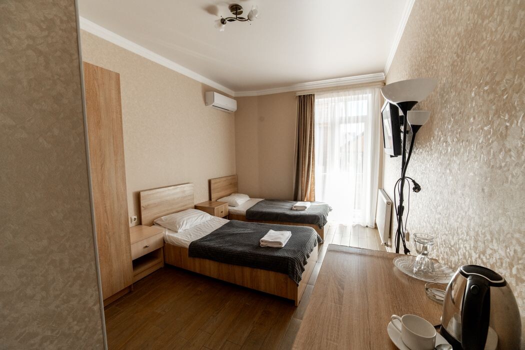 Гостевой дом в Дивноморском предлагает идеальное убежище для тех, кто ценит комфорт и уединение. Двухместный номер с 2 отдельными кроватями стандарт, площадь которого составляет 12 м², спроектирован с максимальным вниманием к деталям. Он оборудован всем необходимым для приятного отдыха: от кондиционера и телевизора с плоским экраном до холодильника и принадлежностей для приготовления кофе. Возможность объединить односпальные кровати добавляет гибкости для любых предпочтений, обеспечивая комфортный сон. Здесь тоже заботятся о ваших потребностях в развлечениях и интернет-соединении, что позволит вам оставаться на связи во время отпуска.