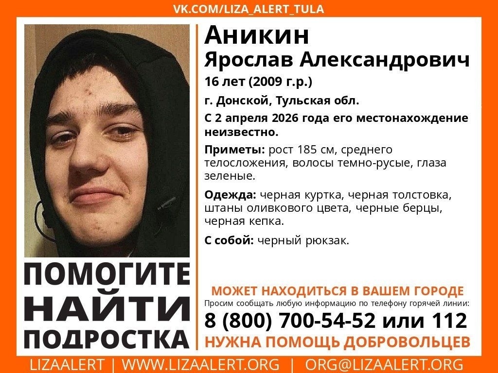 В Тульской области разыскивают 16-летнего Ярослава Аникина из Донского. По информации "ЛизаАлерт", подросток пропал 2 апреля — и до сих пор о его местонахождении ничего неизвестно. Из примет: мальчик ростом 185 сантиметров, среднего телосложения с зелеными глазами и темно-русыми волосами. Ярослав был одет в черную куртку, черную толстовку, штаны оливкового цвета, черные берцы, такого же цвета и кепка. С собой он взял черный рюкзак. Если вы владеете какой-то информацией или видели Ярослава, то можете сообщить об этом по телефону 8 800 700 54 52 или 112.